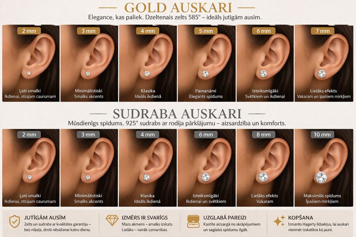 Kad saproti, kā darbojas svars, izmērs, materiāls un akmens, izvēle kļūst vienkārša — un auskari kļūst par to, kam tiem jābūt: komfortablu ikdienas rotu.